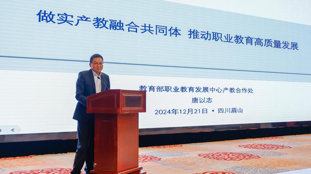 唐以志作“做实产教融合共同体 推动职业教育高质量发展”报告,从高质量发展背景下的产教融合、职业教育产教融合的政策安排、做实做深行业产教融合共同体三方面进行了阐述。