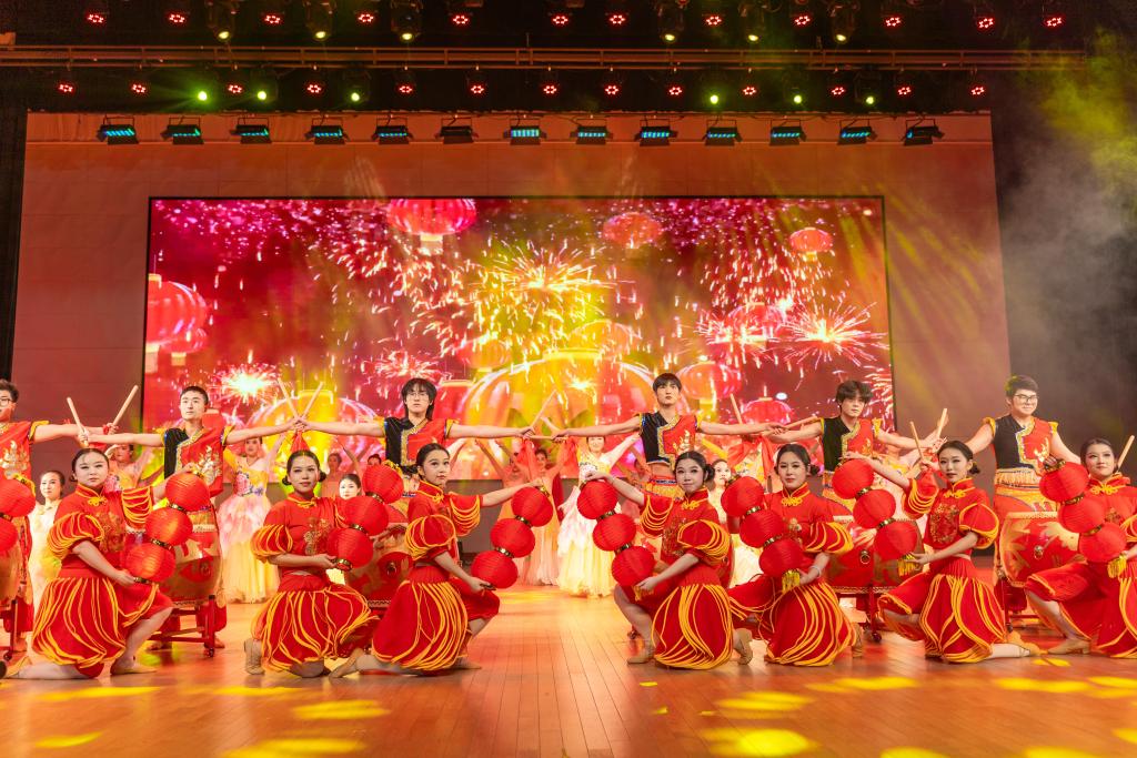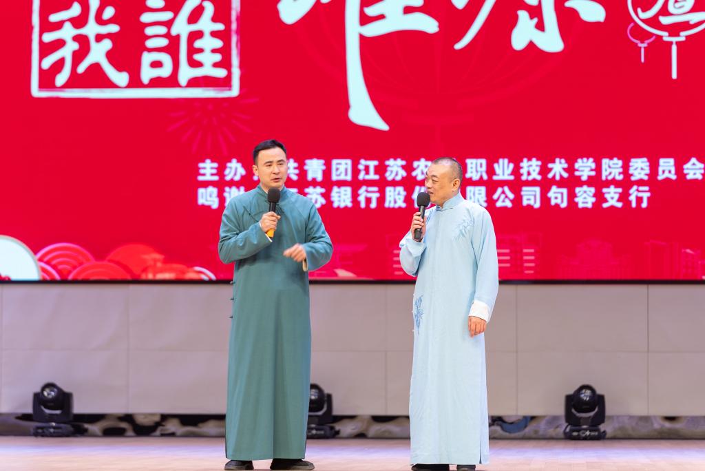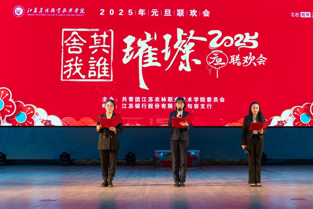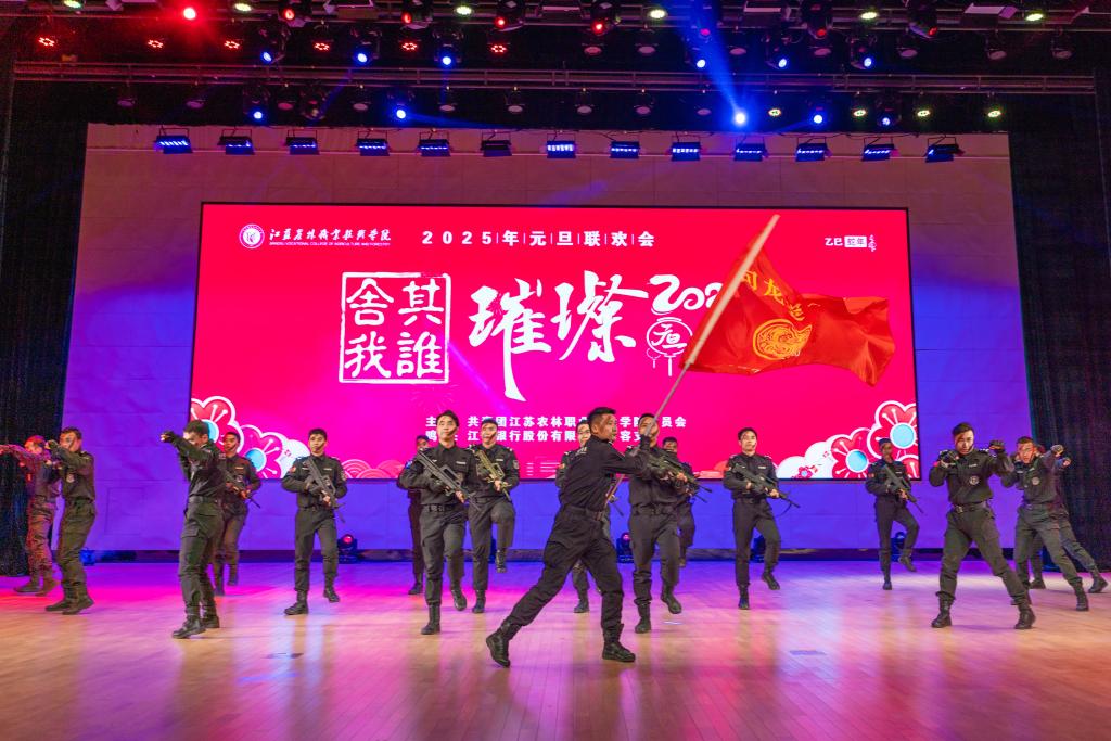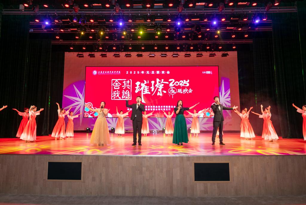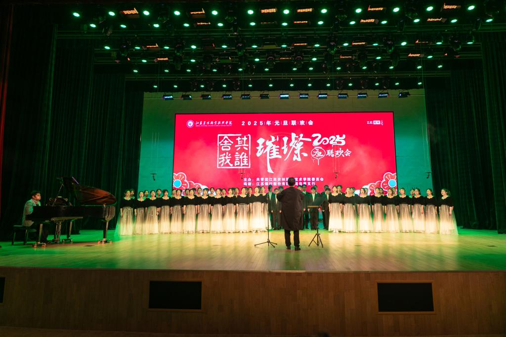 开场舞《盛世欢歌》拉开了联欢会的序幕,大学生艺术团合唱团演唱的《萱草花》温暖开启2025,师生合作的民乐合奏《名著名曲》、舞蹈团同学们表演古典舞《清庭云月》、扬剧高校研习社同学表演的《八段锦》展示了中国传统艺术的魅力,一起致敬经典。联唱《那些年的“情”歌》唱响亲情、友情、爱情和家国情。时尚动感的街舞舞动青春,乐队表演《just the two of us》激情飞扬,句容市文化馆带来的情景朗诵《传承》深情讲述传承的力量,句容市公安局句龙突击队表演情景舞蹈《中国龙》舞出豪迈与气魄,幽默的方言诗朗诵和相声表演赢得了现场阵阵掌声和笑声。联欢会在歌舞《向往》中圆满落下帷幕。