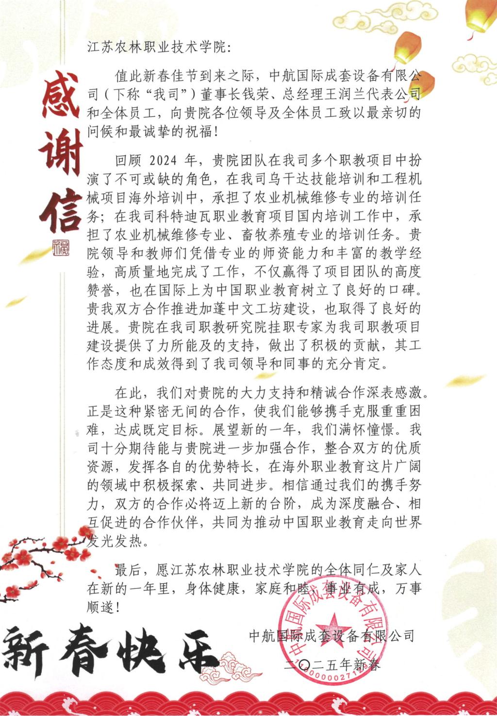近日,中航国际成套设备有限公司向学院发来感谢信,并对全体师生致以新春祝福,对学院在2024年多个职教项目中的卓越贡献表示高度认可和诚挚感谢。
