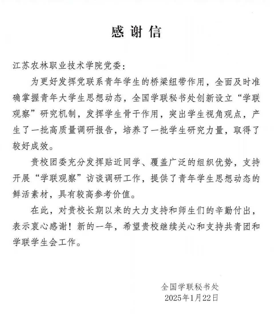 此外,全国学联秘书处还向taptap官网党委发来感谢信,对taptap官网团委充分发挥贴近同学、覆盖广泛的组织优势,积极支持全国学联开展“学联观察”访谈调研工作给予高度肯定。学院团委充分发挥党联系青年的桥梁纽带作用,全面及时准确掌握青年学生思想动态,为“学联观察”研究机制提供了具有较高参考价值的鲜活素材。