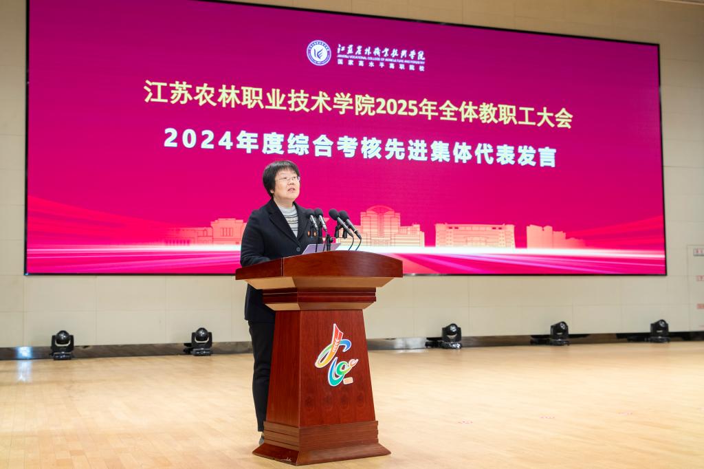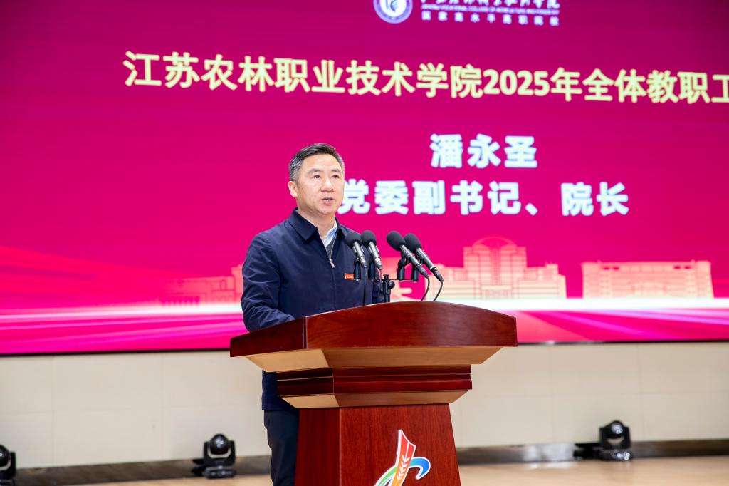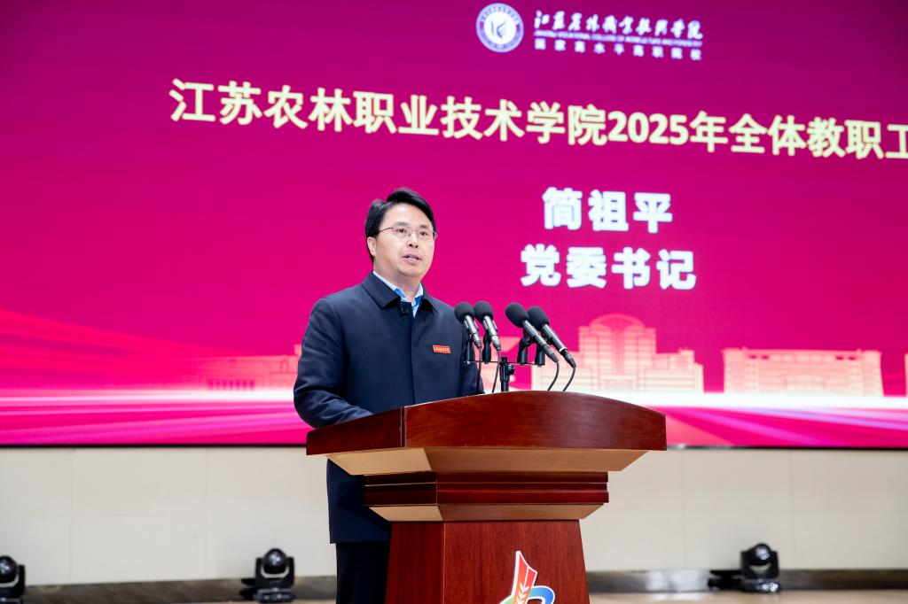 党委书记简祖平在讲话中,对过去一年的工作进行了全面总结,他指出,一年来,全体师生员工砥砺奋进、真抓实干,一步一个脚印把美好蓝图变成生动现实,党建思政工作展现新气象,卓越农林建设展现新成效,幸福农林建设展现新面貌,善治农林建设展现新活力,学院综合实力、办学满意度、办学影响力持续提升。他从全国、行业和学院三个层面分析了学院事业发展面临的新形势、新局面、新挑战,要求全校教职工正视问题和不足,以扎实的作风、务实的举措、十分的斗志,提升办学能力和水平。他对未来的工作进行了部署,提出了提升党建思政水平、谋划“十五五”发展、促进高质量充分就业、提升课堂质量、推进大学文化建设、激发办学活力动能等工作要点,要求全体教职工胸怀“国之大者”、 涵养高尚师德、凝聚发展合力、勇于攻坚克难,奋力开创学院事业发展新局面,为建设一流职业技术大学奠定坚实基础,为江苏“争当表率、争做示范、走在前列”和农业农村现代化做出更大的贡献!