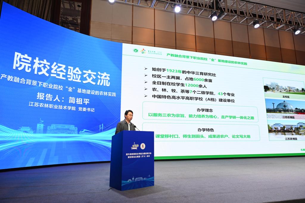 简祖平以“产教融合背景下职业院校‘金’基地建设的农林实践”为主题,从聚焦产业需求高站位谋划两园蓝图、聚焦产教融合一体化贯通产学研用、聚焦协同共建多主体联动运营管理等方面介绍了学院基地建设的经验和成效。