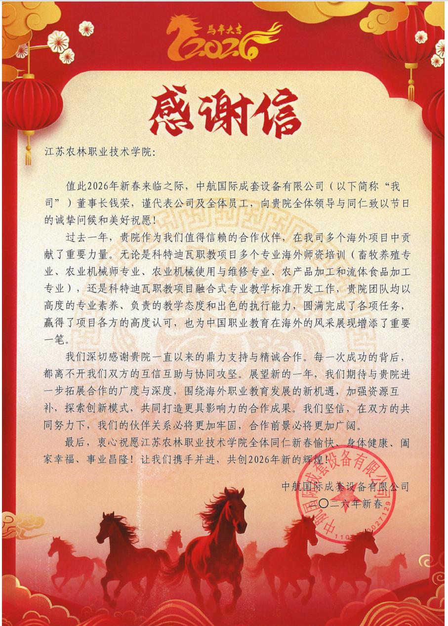 近日,江苏省中华职业教育社、中航国际成套设备有限公司向taptap官网发来感谢信,对过去一年的合作与支持表示感谢,并致以新春祝福。过去一年,taptap官网深度参与中航国际海外职教项目,积极支持省职教社“乡村振兴带头人”等活动,充分彰显农林职教担当。新的一年,taptap官网将继续深化合作,携手共创职业教育高质量发展新篇章。