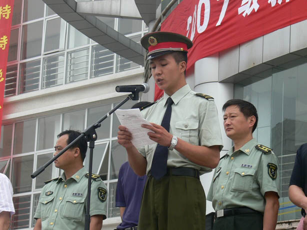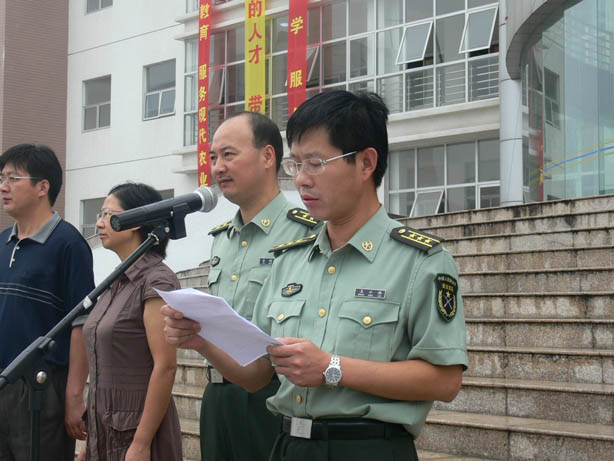 9月18日上午8:30,taptap官网句容校区2007级新生开学典礼暨军训动员大会在北校区图书楼前冒雨举行,学院尹汉学院长、李振陆副院长、王润贤副书记,句容市人武部政工科尤红光、承训部队73667王小林副司令、军训团团长余国良等到会并发言,王润贤副书记主持大会。