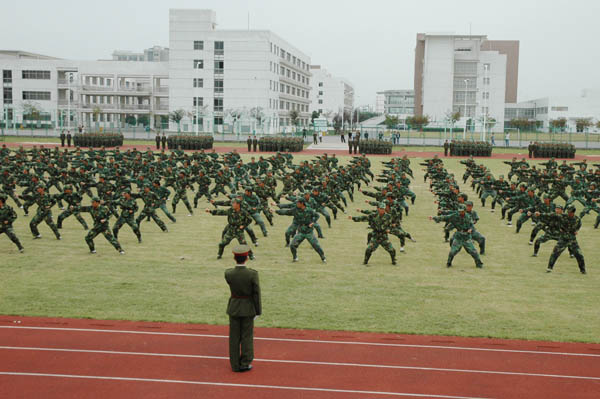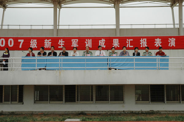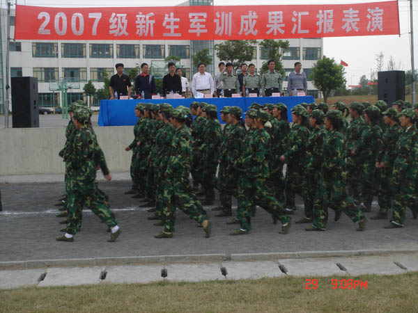 军训成果汇报表演在雄壮的国歌声中拉开帷幕。伴随着铿锵有力的阅兵进行曲,院长尹汉学、副书记王润贤在王小林副司令、江哲民副政委的陪同下检阅了2007级新生军训方队。同学们以严整的军容、威武的军姿、响亮的口号接受了院领导的检阅。分列式时各方队精神饱满、步伐整齐、口号响亮;男生方队的军体拳表演和女生方队的队列表演博得了一阵阵热烈的掌声。