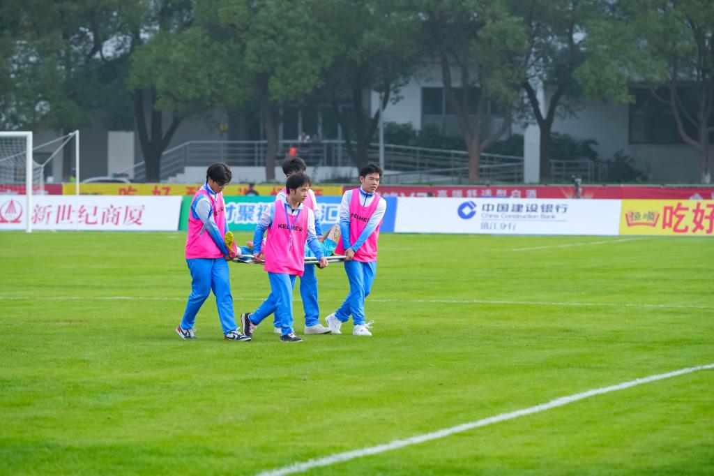 为保障赛事有序推进,赛前,志愿者们开展专项培训,熟练掌握物资分类标准与应急处置流程。比赛当日,他们提前3小时抵达赛场,维护场内秩序,分发物资,引导观众有序进场,为赛事筹备筑牢基础。赛中,针对赛场突发的球员受伤情况,志愿者们反应迅速、操作规范,第一时间携带担架抵达现场,平稳完成伤员转移工作,用高效的执行力为赛事筑牢“后勤防线”。