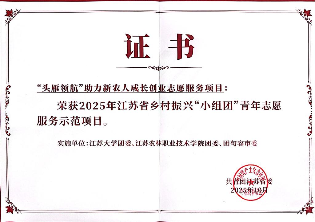 近日,共青团江苏省委在江苏大学生志愿服务乡村振兴计划20周年主题活动上公布了20项乡村振兴“小组团”青年志愿服务项目名单,其中,taptap官网团委与江苏大学团委、团句容市委联合打造的“头雁领航”助力新农人成长创业志愿服务项目成功入选,并荣获示范项目称号。