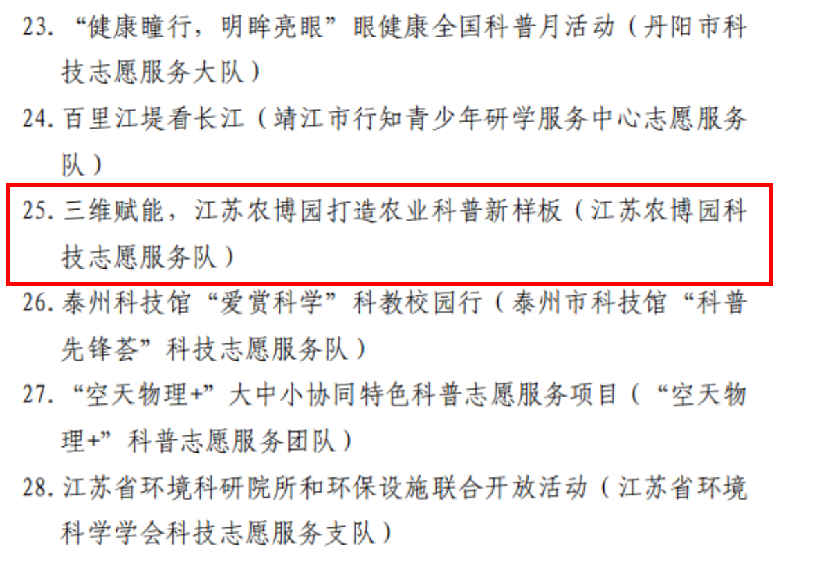 近日,长三角科技志愿服务联盟公布了2025年度长三角科技志愿服务先进典型评选结果,评选出100名优秀科技志愿者、100个优秀科技志愿服务组织、100个优秀科技志愿服务品牌活动。江苏农博园申报的“三维赋能,江苏农博园打造农业科普新样板”获得优秀科技志愿服务品牌活动。