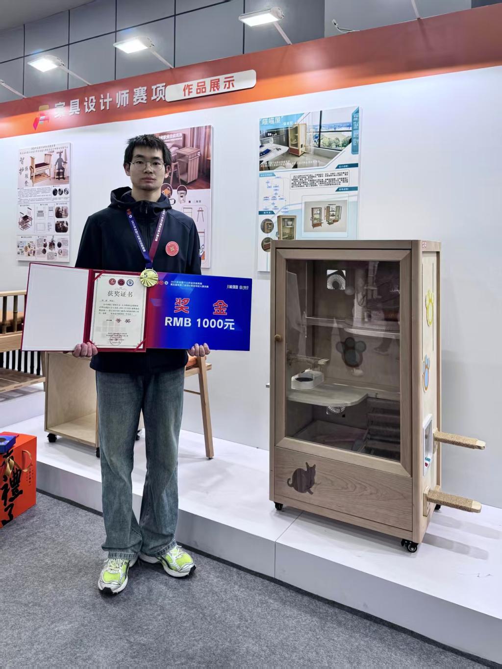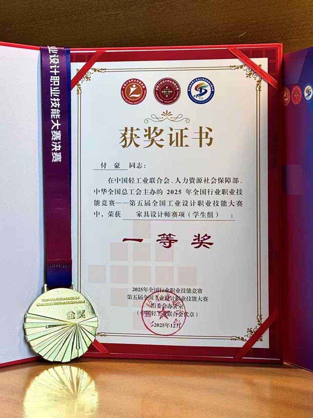 在刚刚落幕的2025年全国行业职业技能竞赛——第五届全国工业设计职业技能竞赛决赛中,风景园林学院家具设计与制造专业2023级付豪同学代表江苏省出征,凭借出色的设计理念、精湛的专业技能与扎实的综合素养,在竞争白热化的家具设计师赛项(学生组)中脱颖而出,一举摘得一等奖殊荣!