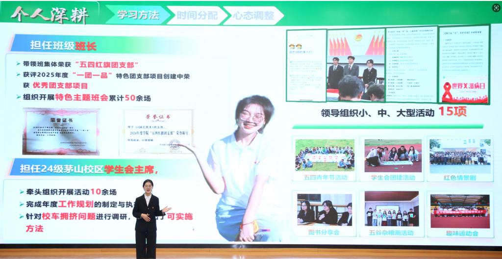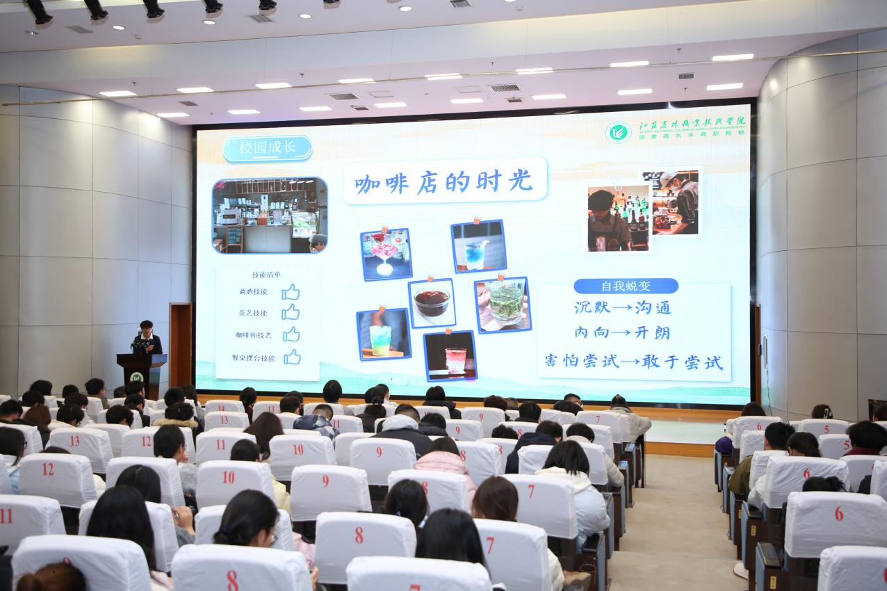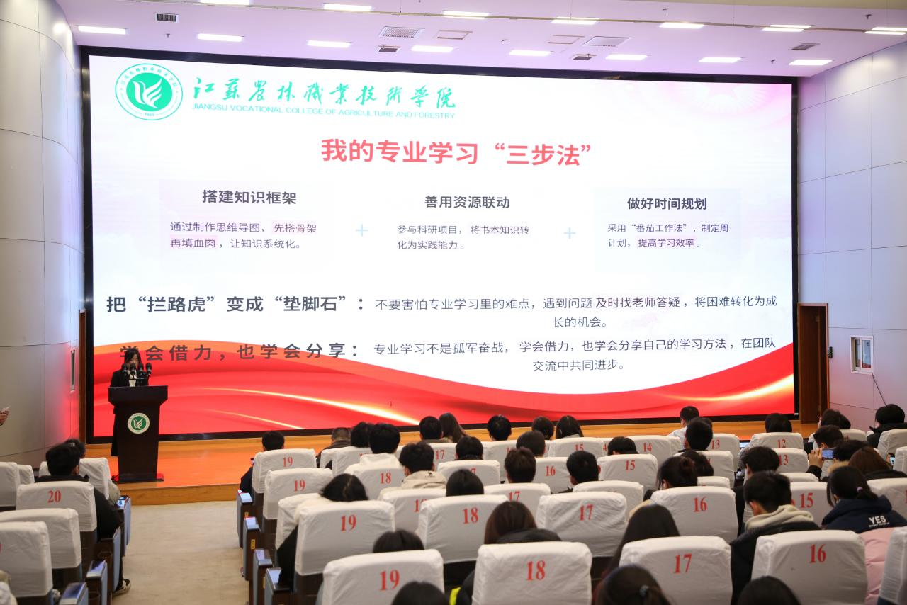 核心分享环节中,8位来自各二级学院及茅山校区的优秀学子依次登台,他们紧扣学习方法、实践经历、参赛经验等核心主题,结合自身鲜活案例分享成长心得,内容兼具实用性与借鉴性。密集的干货分享、真挚的经验交流,引发在场学生的强烈共鸣,现场掌声阵阵、氛围热烈,为师生带来深刻启发。