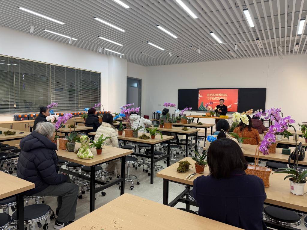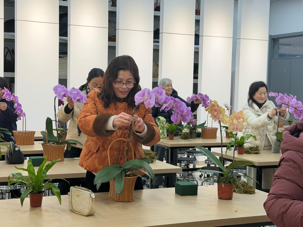 活动现场花香四溢,气氛温馨。在花艺老师们的指导下,老同志们精心修剪枝叶、搭配色彩,亲手创作出一个个精美的插花作品。大家一边交流技艺,一边叙旧谈心,现场欢声笑语不断,洋溢着浓浓的节日喜悦。一位教师说:“这是我记忆中最开心的一次插花活动,看着手中的‘作品’,感觉自己一下子年轻了十岁,感谢学校对我们退休人员的关爱!”