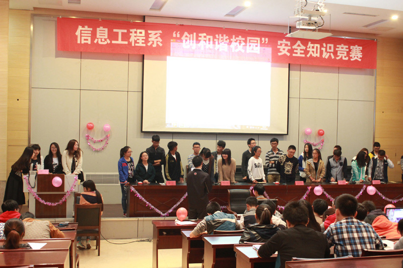 10月16日晚,信息工程系“创和谐校园”安全知识竞赛在研发楼报告厅成功举行。系学工办辅导员、学生会相关成员及各班级宿舍长参加了此次活动。