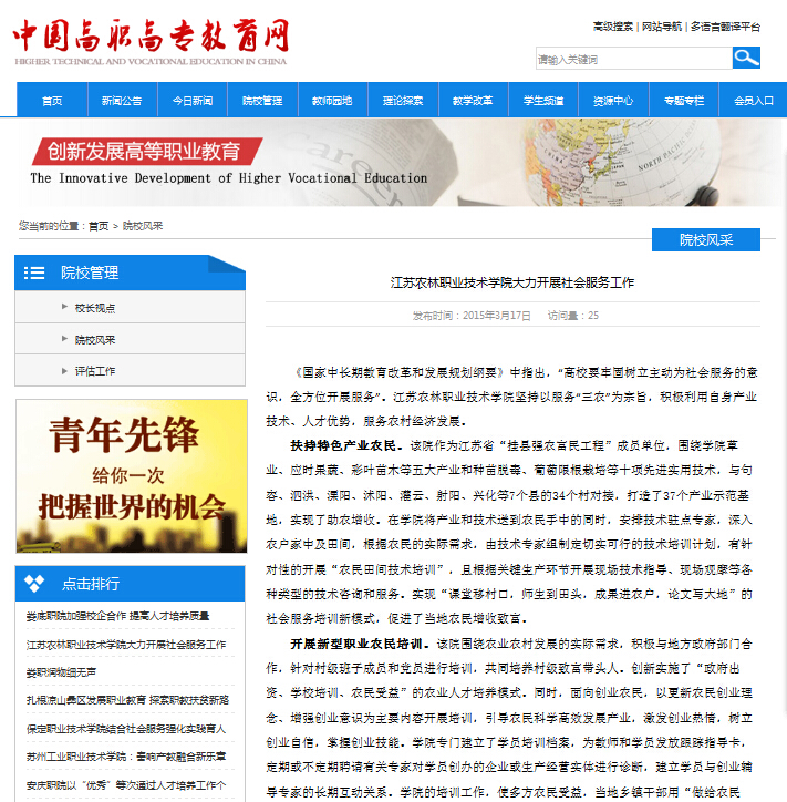 扶持特色产业农民。该院作为江苏省“挂县强农富民工程”成员单位,围绕学院草业、应时果蔬、彩叶苗木等五大产业和种苗脱毒、葡萄限根栽培等十项先进实用技术,与句容、泗洪、溧阳、沭阳、灌云、射阳、兴化等7个县的34个村对接,打造了37个产业示范基地,实现了助农增收。在学院将产业和技术送到农民手中的同时,安排技术驻点专家,深入农户家中及田间,根据农民的实际需求,由技术专家组制定切实可行的技术培训计划,有针对性的开展“农民田间技术培训”,且根据关键生产环节开展现场技术指导、现场观摩等各种类型的技术咨询和服务。实现“课堂移村口,师生到田头,成果进农户,论文写大地”的社会服务培训新模式,促进了当地农民增收致富。