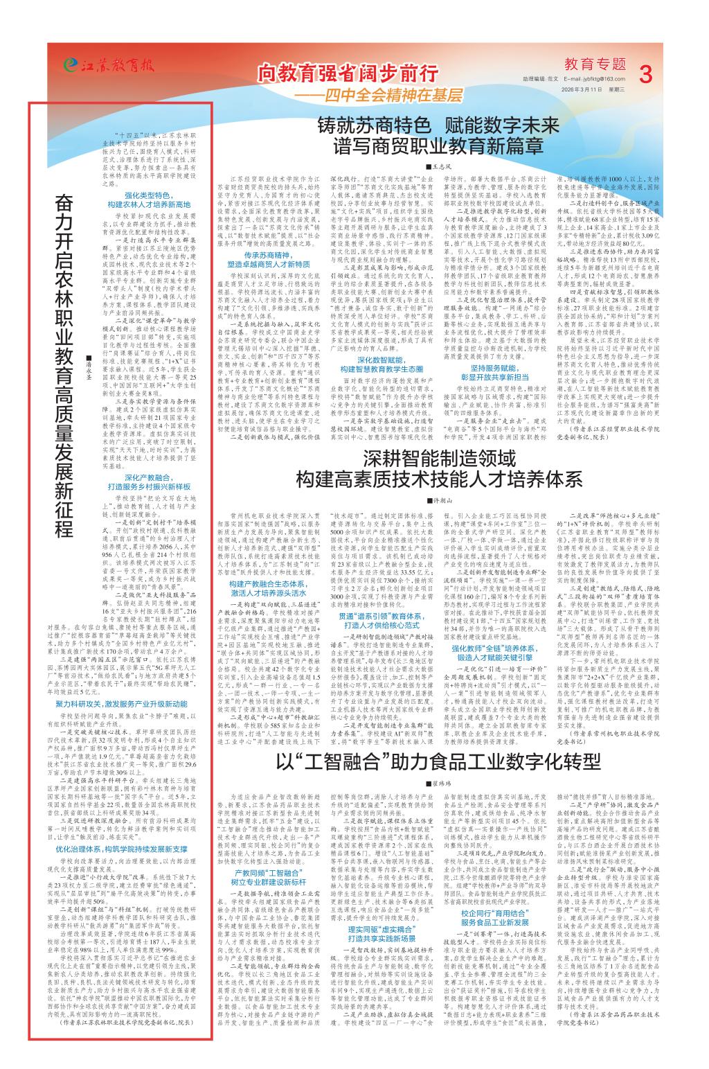 3月11日,《江苏教育报》刊发学院党委副书记、院长潘永圣署名文章《奋力开启农林职业教育高质量发展新征程》。文章系统回顾了“十四五”以来学院以服务乡村振兴为己任,围绕育人模式、科研范式、治理体系进行的系统性、深层次变革,从构建农林人才培养新高地、打造服务乡村振兴新样板、激发服务产业升级新动能、构筑学院持续发展新支撑四个方面,全面展示了高水平专业群建设、“定制村干”培养、亚夫科技服务、关键核心技术突破及治理效能提升等创新实践与显著成效,充分彰显了学院在推进农业现代化和职业教育高质量发展中的使命担当与示范引领。