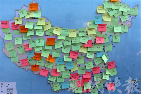 值得一提的是,来自不同省份的学子们还把自己对祖国的祝福语贴在了 " 中国地图 " 的寄语板上,这些祝福语字里行间抒发着对祖国的热爱。