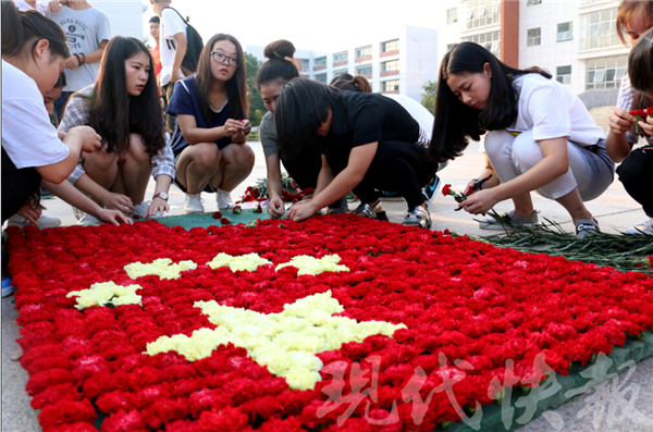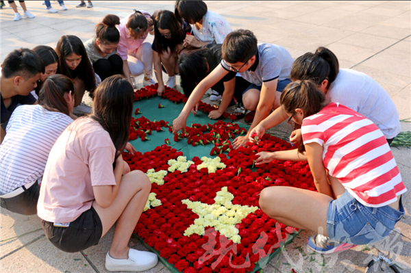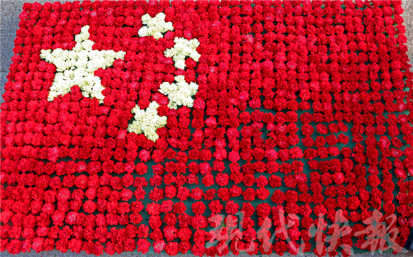 26 日下午 5 点,经过学生们约 2 个小时的巧手精心拼织,一面特别的五星红旗拼成了。现代快报记者看到,这面五星红旗用红色的康乃馨作 " 底色 "、用黄色的康乃馨拼成 " 五角星 ",看起来格外鲜艳。