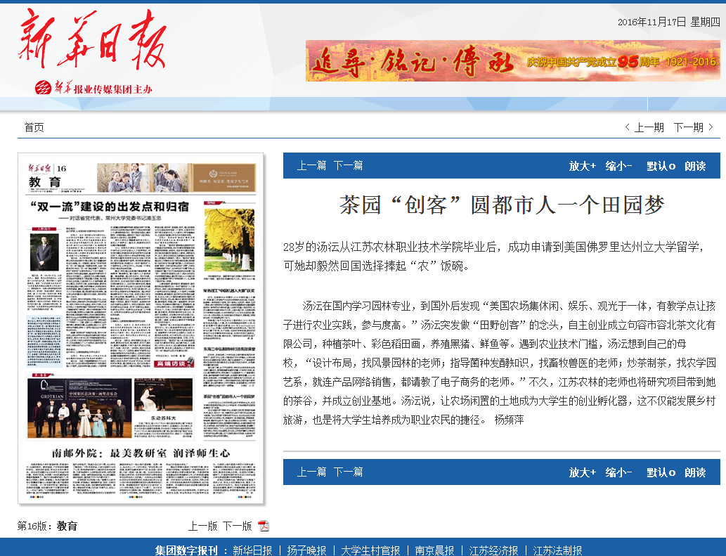 汤沄在国内学习园林专业,到国外后发现“美国农场集休闲、娱乐、观光于一体,有教学点让孩子进行农业实践,参与度高。”汤沄突发做“田野创客”的念头,自主创业成立句容市容北茶文化有限公司,种植茶叶、彩色稻田画,养殖黑猪、鲜鱼等。遇到农业技术门槛,汤沄想到自己的母校,“设计布局,找风景园林的老师;指导菌种发酵知识,找畜牧兽医的老师;炒茶制茶,找农学园艺系,就连产品网络销售,都请教了电子商务的老师。”不久,江苏农林的老师也将研究项目带到她的茶谷,并成立创业基地。汤沄说,让农场闲置的土地成为大学生的创业孵化器,这不仅能发展乡村旅游,也是将大学生培养成为职业农民的捷径。