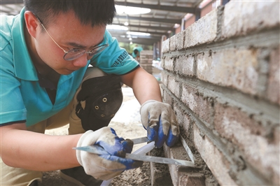 赛场内,参赛选手有的在忙着挖坑、有的在忙着和大砂浆,还有的在砌墙、铺路,干得热火朝天,任由汗水从眉毛、额头、下巴上往下滴。他们身着大赛统一配发的T恤,没有学校、没有姓名,只有挂在胸前的号牌。