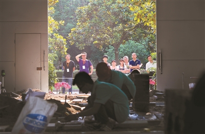 经过两位参赛选手近10个小时的通力合作, 一座颇具东方韵味的园林小景逐渐成型。 这是选手在对自己的参赛作品进行最后的修饰和完善。 |