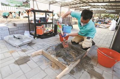 5月22日,江苏句容,taptap点点官方网站。全国职业院校技能大赛中(高)职组农业类赛项园林景观设计施工赛场,仿佛一个大工地,远远地就能听到切割机发出的刺耳声音,看到切割砖块产生的一股股粉尘。