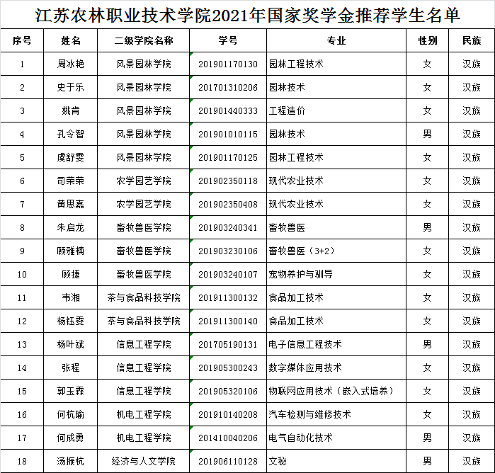 根据《省教育厅省教育厅关于做好 2021 年普通高校国家奖学金有关工作的通知》(苏教助函〔2021〕12 号)文件精神,经本人申请、班级推荐、二级学院初审,学校最终审核,现拟推荐以下18位同学申报国家奖学金,现予以公示。对以下获奖同学如有异议,请于2021年10月27日前到学生资助中心孙颖老师处反映,地点:综合楼207室;联系电话:0511-87290202;邮箱:jsnlzz@163.com。