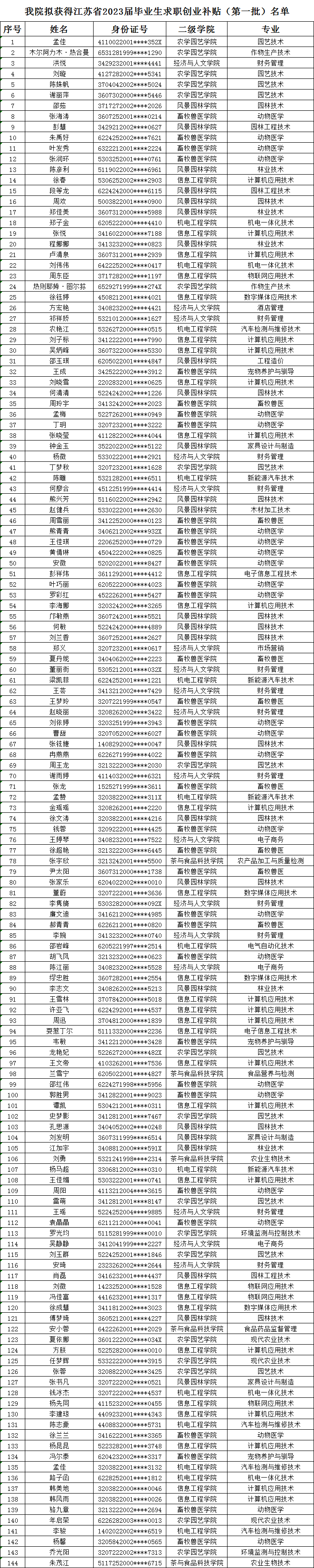 根据《省人力资源和社会保障厅、省教育厅、省财政厅关于做好求职创业补贴发放工作通知》(苏人社发〔2019〕198号)、《省人力资源和社会保障厅、省教育厅、省财政厅关于进一步明确求职创业补贴申领发放有关问题的通知》(苏人社函〔2021〕154号)的文件要求,经本人申请,学院学生工作处初审,句容人社复审。现拟定以下同学享有江苏省2023届毕业生求职创业补贴(第一批)发放资格,现予以公示。对以下获得补贴发放资格的同学如有异议,请于2022年10月15日前到学工处董燕红老师处反映,地点:综合楼二楼东205,联系电话:0511-87290222。