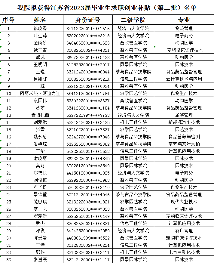 根据《省人力资源和社会保障厅、省教育厅、省财政厅关于做好求职创业补贴发放工作通知》(苏人社发〔2019〕198号)、《省人力资源和社会保障厅、省教育厅、省财政厅关于进一步明确求职创业补贴申领发放有关问题的通知》(苏人社函〔2021〕154号)的文件要求,经本人申请,学生工作处初审,句容人社复审。现拟定以下同学享有江苏省2023届毕业生求职创业补贴(第二批)发放资格,现予以公示。